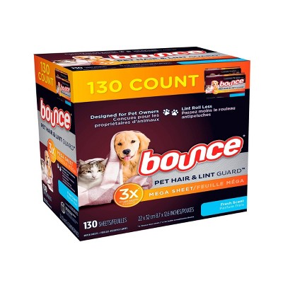 Up to 2 cash back Shop for Bounce Pet Hair Lint Guard Fresh Scent Mega Dryer Sheets 80 ct at Kroger. When you are cleaning your clothes throw in a dryer sheet and it will massively reduce the amounts of hair you find on your clothes. Bounce Pet Hair Dryer Sheets work in the dryer to actively repel dog and cat hair from your clothes.